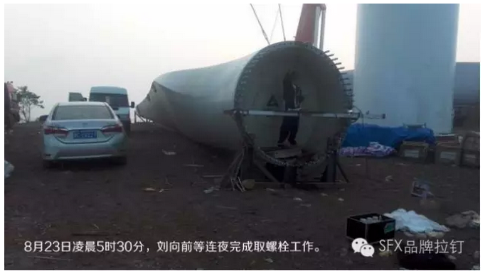 2016年8月22日上午10時(shí),洛陽(yáng)信成精密機(jī)械有限公司取斷螺栓項(xiàng)目部接到了一個(gè)緊急求助電話。電話那邊是湖北荊門的一家風(fēng)電施工企業(yè),正在安裝的風(fēng)葉上有一顆M36雙頭螺栓粘死,為了保證質(zhì)量以及風(fēng)葉安裝的安全,項(xiàng)目只得暫時(shí)停工。
