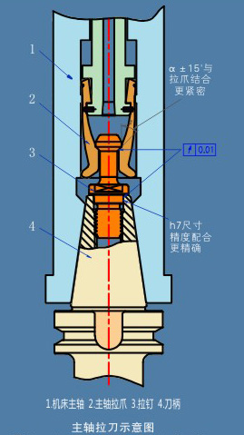 拉釘標(biāo)準(zhǔn)及其組合:拉釘是能過(guò)螺紋固定在各種工具柄的尾端的零件。機(jī)床主軸內(nèi)的拉緊機(jī)構(gòu)借助它把刀柄拉緊在主軸中、拉緊力的保持靠一組彈簧,拉緊后就足以防止刀柄及刀具從高速旋轉(zhuǎn)的主軸中脫出。