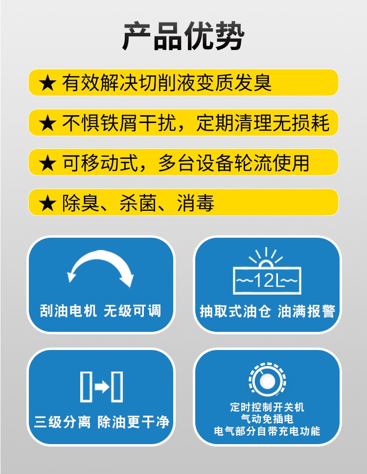有效解決切削液變質(zhì)發(fā)臭不懼鐵屑干擾,定期清理無(wú)損耗可移動(dòng)式,多臺(tái)設(shè)備輪流使用除臭、殺菌、消毒" />